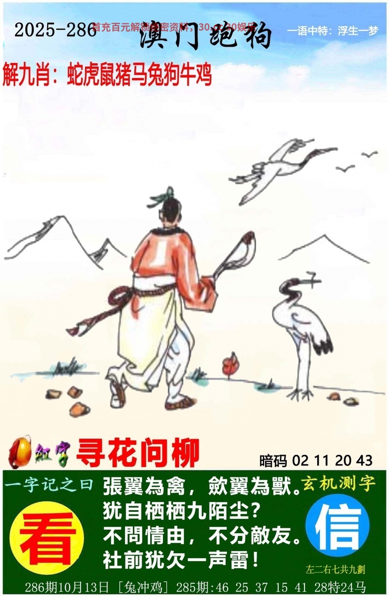 287期:小小燕子秋冬飞,五湖四海蛇为伴。开:猴34